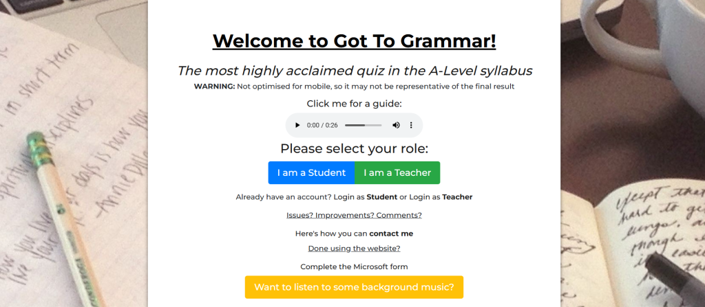 Moreover, I also mentioned my revision grammar website Got to Grammar, which I made in Year 13 for my Computer Science coursework. When I first showcased this to my English class as part of my Evaluation stage back in Year 13, they seemed to really enjoy it, despite being a little problematic in terms of the scoreboards.