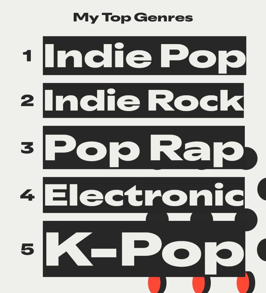 Yeah, so like I said before, pop has and always will be my favourite music genre. I have recently been getting back into K-Pop again, after an initial enjoyment a few years back with Blackpink and now I’m listening to groups such as Red Velvet, NCT 127 and Aespa. Again, I wouldn’t say I’m the biggest fanatic but I do dabble. These were my top genres in 2023: