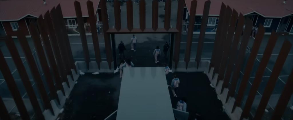 The next shot we are shown is a high angle long shot of prisoners, leaving what I presume is a transportation truck. In this, they are all wearing a cape of the American flag; this iconography feels like a deliberate tongue-and-cheek nod to Homelander’s new regime, where the expectation that these prisoners are property of not just Vought but of Homelander. The video‘s description states that the location is a “Freedom Camp”, an ironic paradox that feels so authentic to this show.