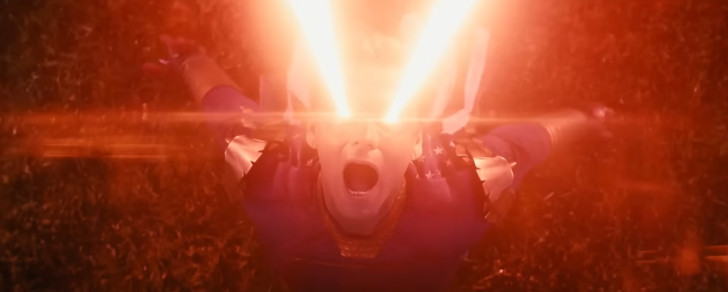 Perhaps the most provocative shot in terms of storytelling is where Homelander’s lasers are targeted towards the sky. This could take place during a fight, where he has submitted to someone’s will by being on his knees. From a long shot, it appears that Soldier Boy is with him, slowly walking away (maybe he has suggested that the two should part ways and Homelander is furious).