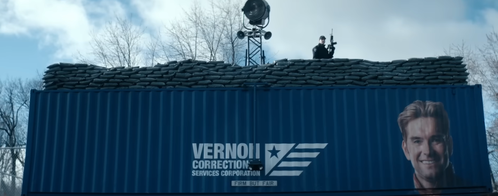 It certainly seems to be a correction facility funded by Vought, with a cut to a medium shot of a blue container titled “VERNON CORRECTION SERVICES CORPORATION”; this is supplemented by the tagline “FIRM BUT FAIR”, with this juxtaposition attempting to romanticise this new authoritarianism. Especially with that grin on Homelander’s face.