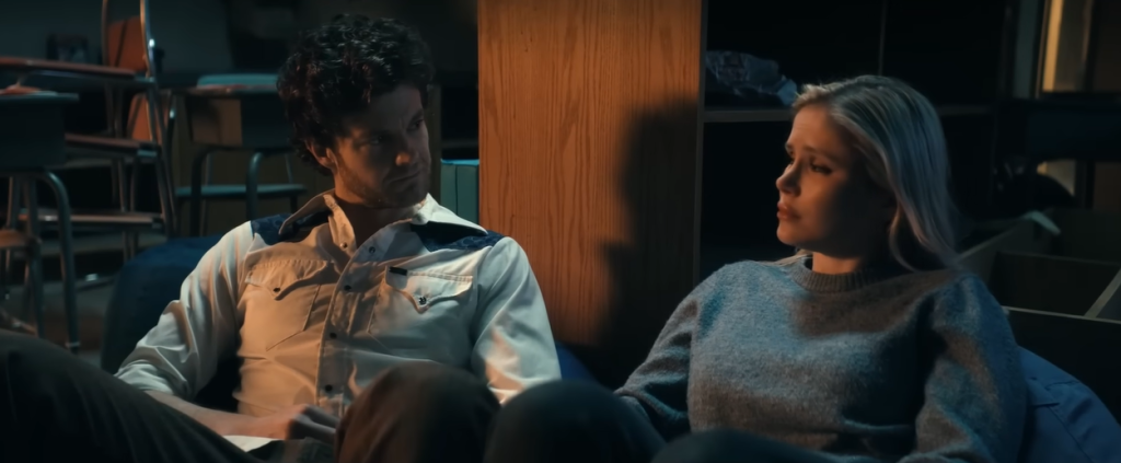 It then cuts to black and shows a long shot of Hughie and Starlight sat on a blue bean bag inside a classroom, a much more drastic change compared to their cozy apartment in S4. Hughie’s voiceover continues by saying “and if you can’t, then I’m just gonna fight for both of us”; we can assume he is talking to Starlight in this context, who despite regaining her powers in the S4 finale after a season-long struggle of calling upon them, is still resolving her inner conflict.