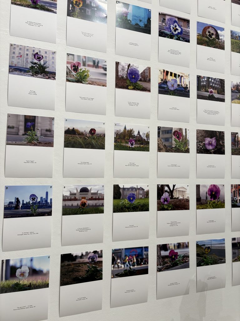 There are a huge range of projects and works on display by different creatives and organisations. Each piece brings a new perspective and ensures that the exhibition doesn’t feel repetitive. One of my personal favourite pieces was the wall showcasing The Pansy Project. This initiative plants a pansy at the site of homophobic and transphobic abuse, and has been running since 2015. Paul Hartfleet’s project helps to shed light on what is at times a silent issue in a powerful way. The wall of photos showcasing pansies from around the world and why they were planted is incredible impactful.